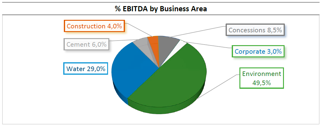 During the first half of 2020, the revenues stood at EUR 2,822.2 million, 5.7%, less than the first half of 2019. This is due to the impact of the measures taken since mid-March in most of the countries in which the Group operates to combat the COVID-19 health crisis. With regards to the business areas, the effect was less in Environment and Water, since these areas provide essential services, with a greater impact in the Construction and Cement areas. Moreover, the Concession activity registered an increase in its contribution, after the acquisition of the majority stake in the Cedinsa group in November of last year.